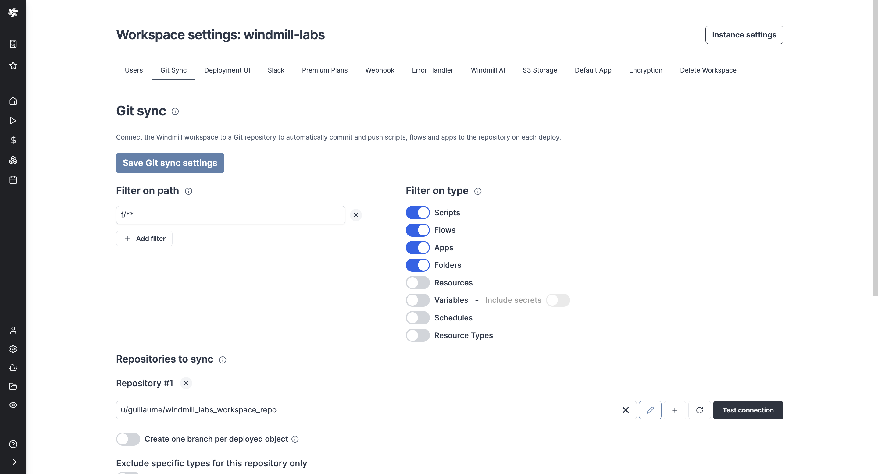 All scripts, flows and apps located in the workspace will be pushed to the Git repository. You can filter Git sync on path so that only the scripts, flows and apps with a matching path will be pushed to the Git repository. By default, everything in folders will be synced (with rule f/**).