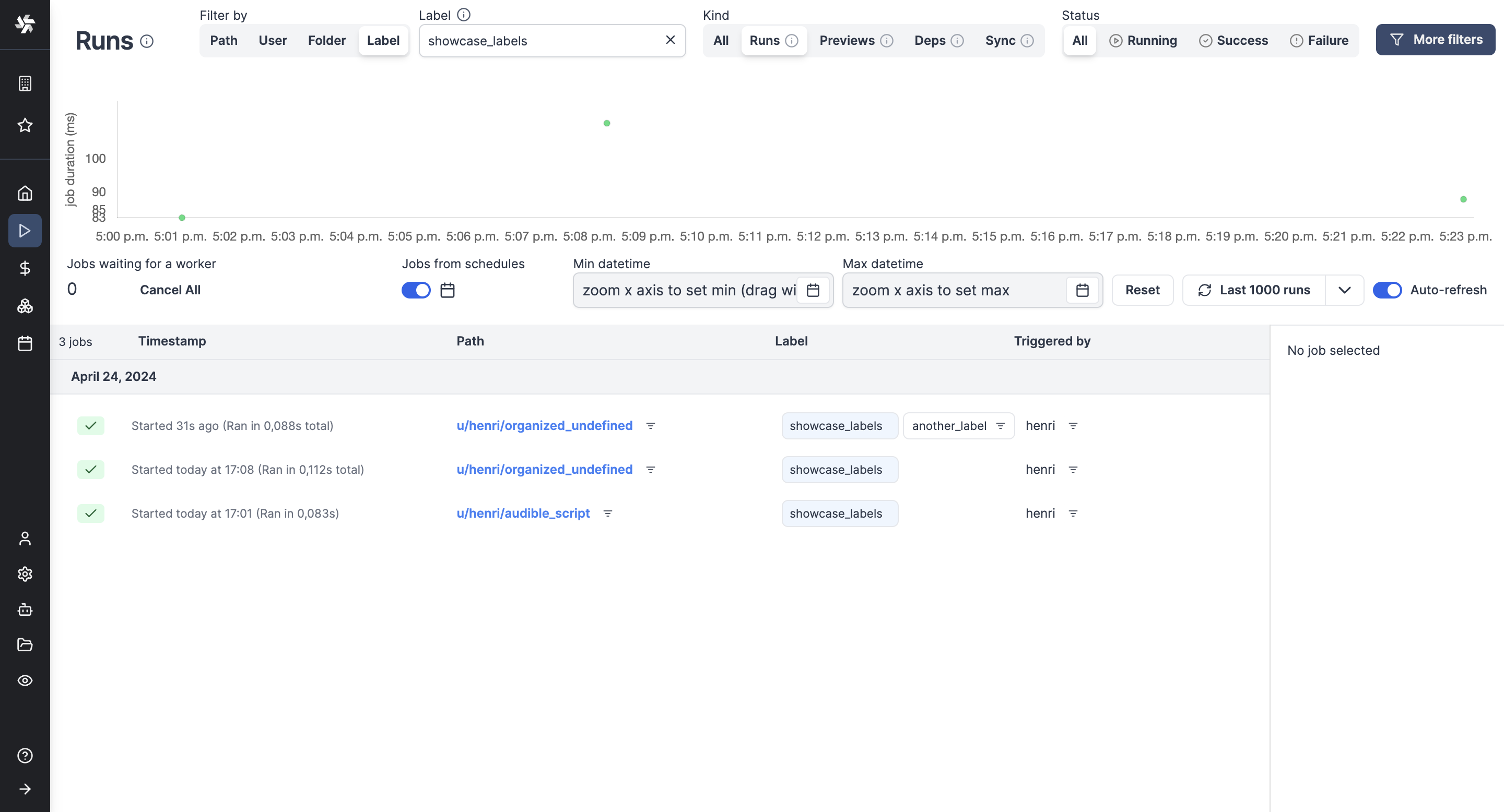 Each workspace has a dedicated Runs menu that allows you to visualise all past and future runs. In Windmill, each run is associated with a job.