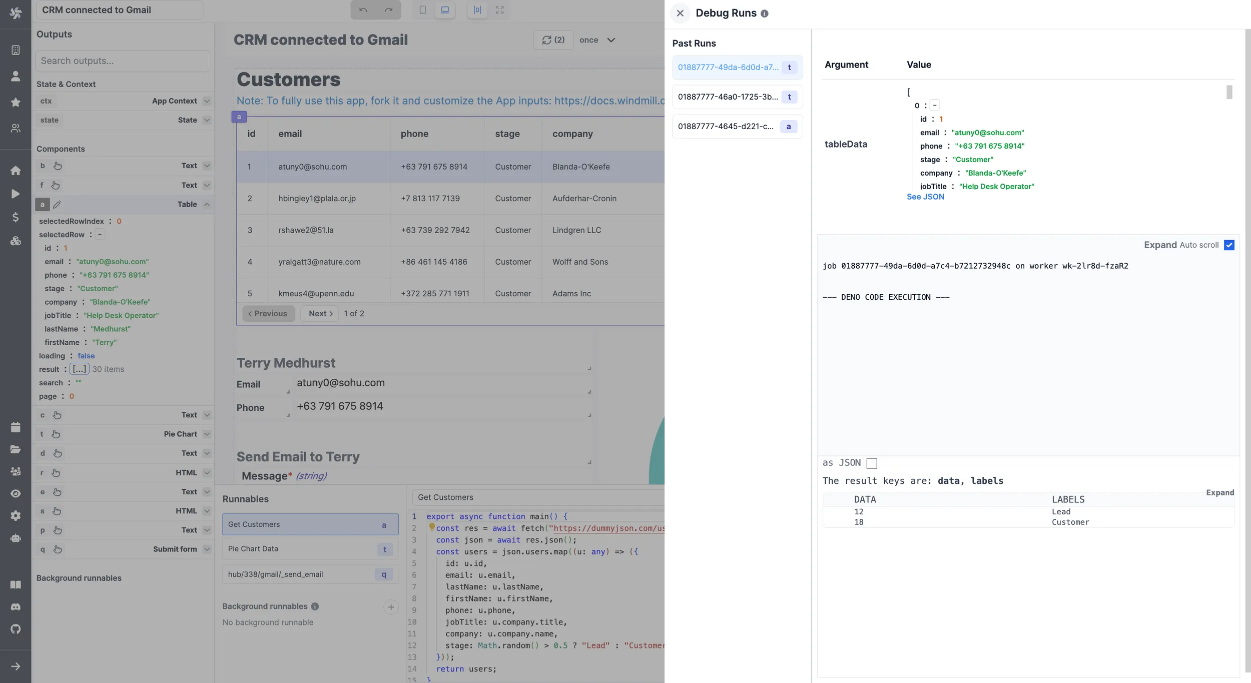 Although Windmill provides auto-generated UIs to scripts and flows, you can build your own internal applications designed to your needs. Either with our integrated app editor, or by importing your own React/Vue/Svelte apps.